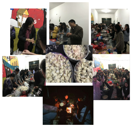 12月22日下午五点半,大家热热闹闹的把教师提前准备调制好的饺子馅、和好的面等材料搬到租用的农家乐场地,摆放好后,师生们围坐在一起开始亲手实践,擀皮的擀皮,包饺子的包饺子,放饺子的更把饺子放得错落有致,场面很是精彩,虽然出现了奇怪的、各式各样的饺子,但那是每个人亲手创造的成果,同时更体现了各个地方的不同风俗和饺子样式。另外同学们还准备了烤串、火锅等,场面非常热闹。