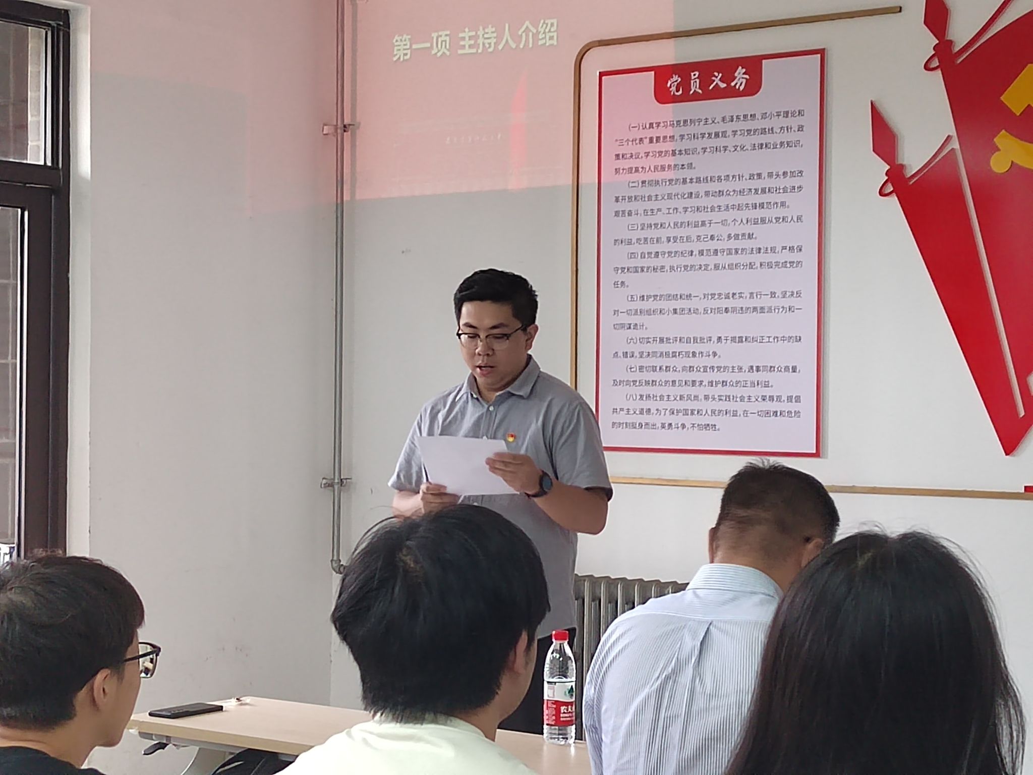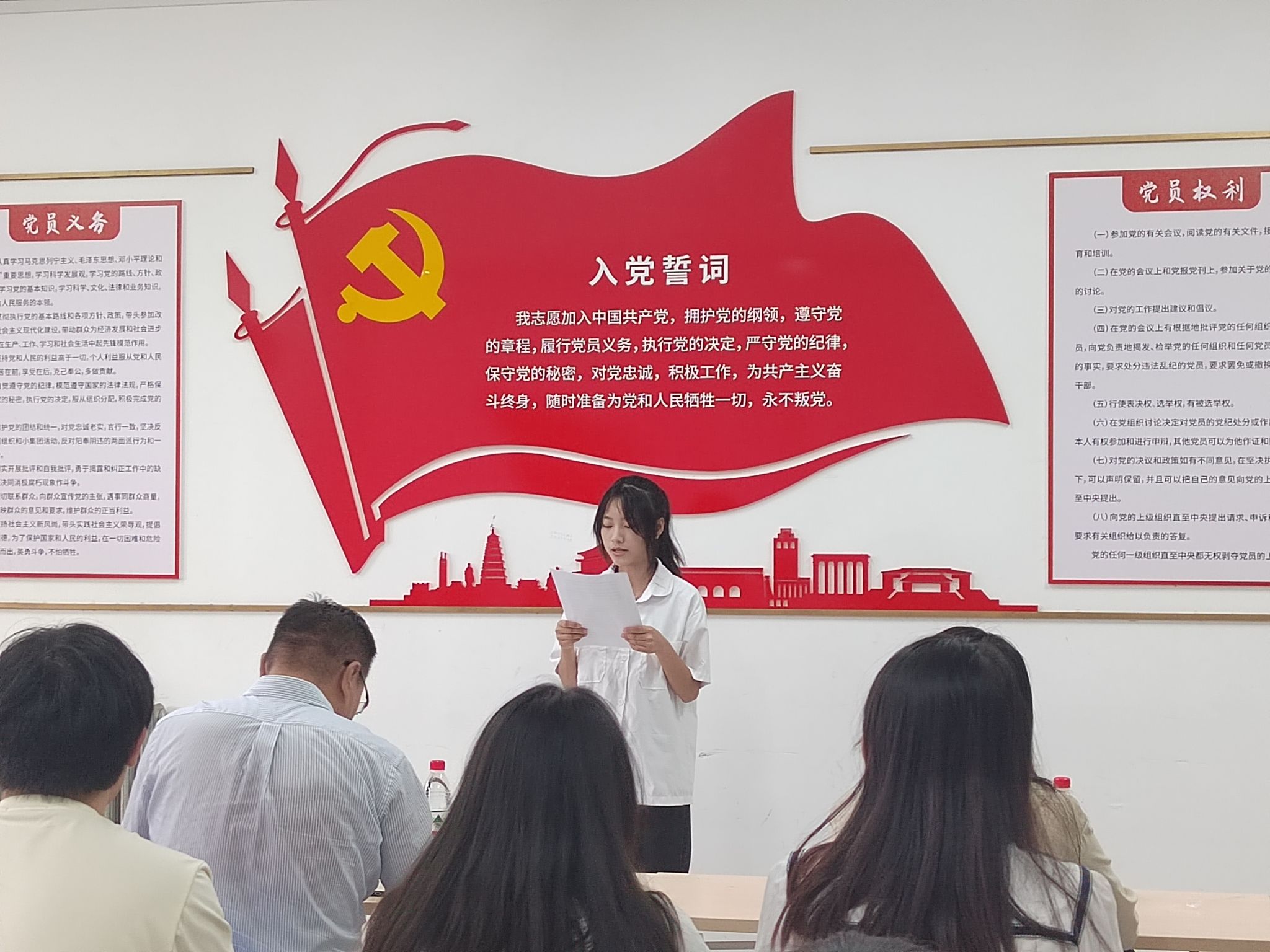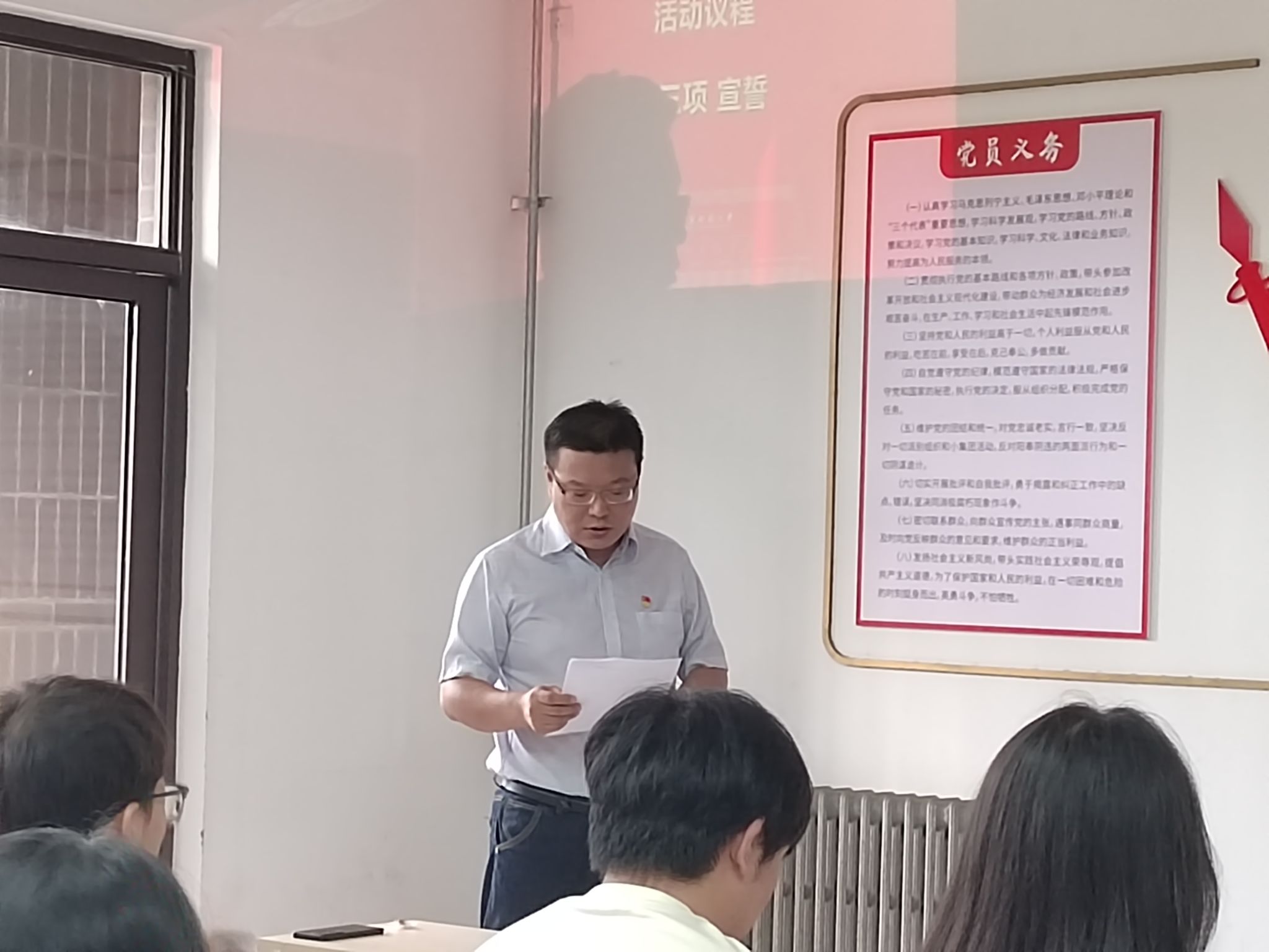 在预备党员入党宣誓环节,首先由学院党委副书记杨占林宣读对同意接收陈蕾、陈明泽、余添、宗宇欣、简华进、王宁、支炜同志为中共预备党员的批复。