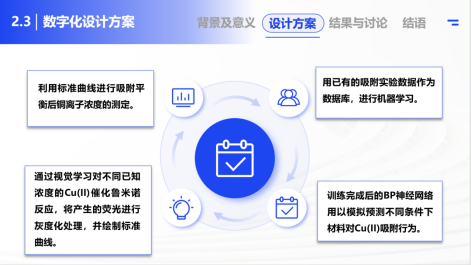 自2024年初,参赛团队在学院支持下启动创新项目,学院张思敬教授、陈双莉老师、刘文老师从项目选题、方案设计到实验验证等阶段,对项目进行了全面培育和打磨。参赛团队依托学院专业学科优势,围绕吸附材料对铜离子的吸附实验进行数字化研究,利用视觉学习和BP人工神经网络的数字化手段,可实现对铜离子的数字化测定以及模拟预测特定条件下吸附材料的铜离子的吸附量,为实验数字化创新发展贡献化工学子力量。