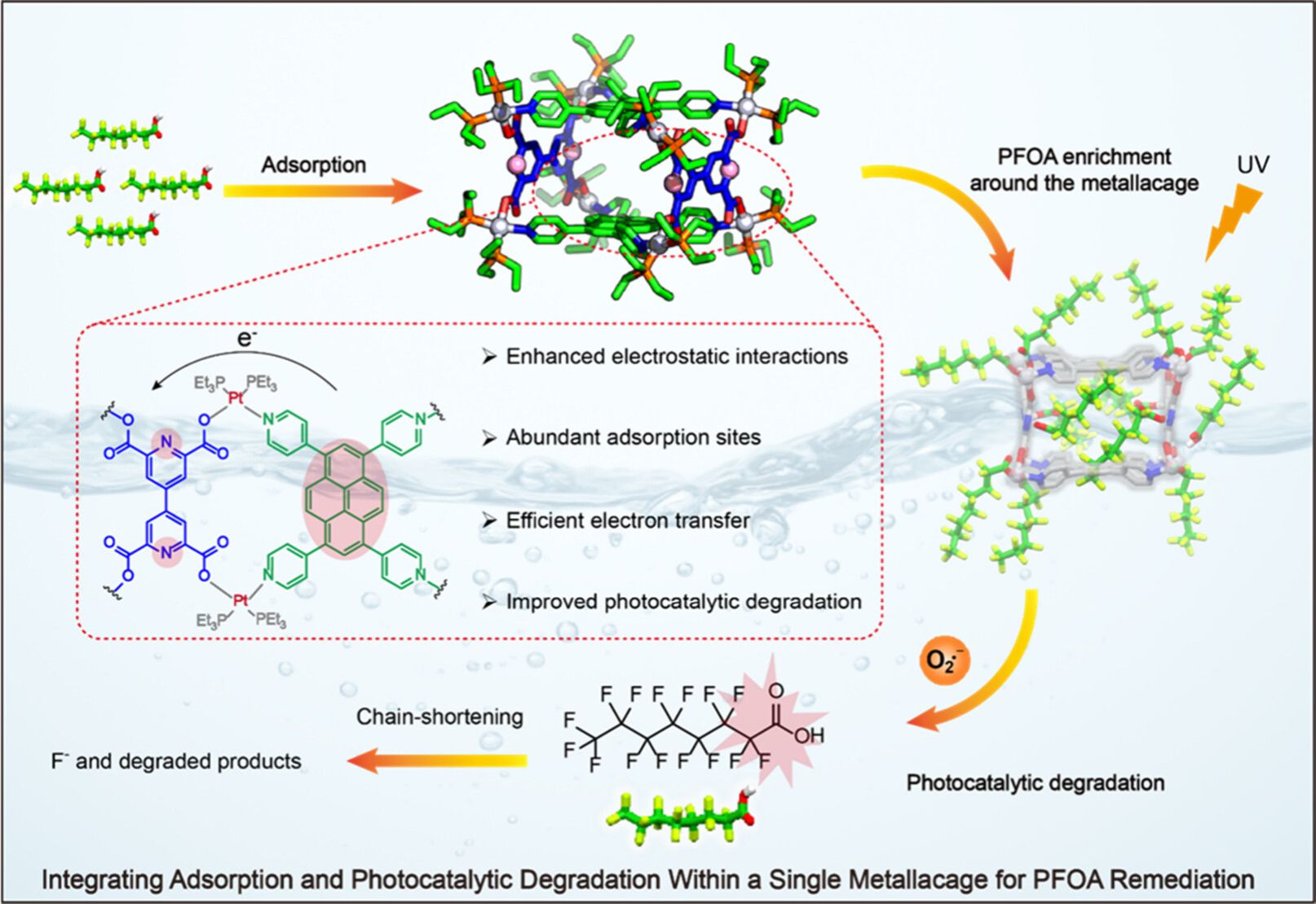 针对这一难题,研究团队设计并制备了两种芘基多组分金属配位笼,构建了独特的“吸附-光催化”双功能平台。其中,引入4,4'-联吡啶羧酸配体的金属配位笼,通过静电作用与氢键协同,对PFOA展现出高达1223 mg/g的优异吸附容量。在光照下,该金属笼的芘基光敏单元与联吡啶电子受体之间发生高效的笼内电子转移,促进超氧阴离子自由基(O2•⁻)的生成,进而攻击被富集的PFOA分子的羧基,通过链缩短反应机制,最终在6小时内实现91%的高脱氟率。本工作从分子层面揭示了金属配位笼中吸附位点与催化中心的高效协同机制,为治理持久性有机污染物提供了新思路。