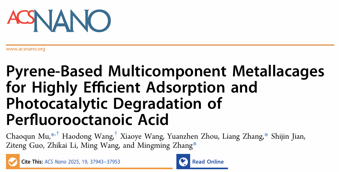 近日,必赢线路检测3003张良教授团队在吸附-光催化协同处理全氟烷基类污染物方面取得重要进展,相关工作以“Pyrene-Based Multicomponent Metallacages for Highly Efficient Adsorption and Photocatalytic Degradation of Perfluorooctanoic Acid(芘基多组分金属有机笼用于全氟辛酸的高效吸附与光催化降解)”为题,发表在国际著名期刊ACS Nano(影响因子16.0,中科院一区top期刊,Nature Index收录期刊)。必赢线路检测3003青年教师穆超群与硕士研究生王浩东为论文共同第一作者,张良教授和西安交通大学张明明教授为共同通讯作者。我校为论文第一完成单位,西安交通大学为主要合作单位。