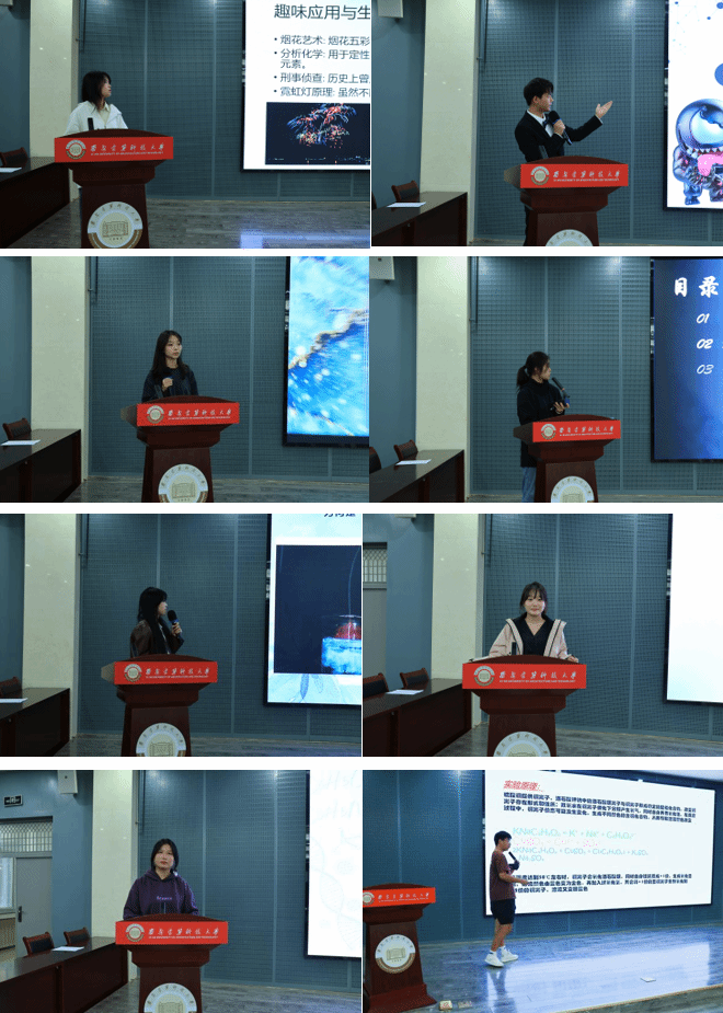 展示环节,八支决赛队伍依次上台,围绕各自的创新实验项目进行了答辩。参赛作品内容涵盖广泛,研究视角丰富多元,从材料构建、光学现象解析、色彩成因探究,到探究反应转化机制,均体现出同学们对化学原理的深入探究与创新应用,以及对化学学科的浓厚热情。