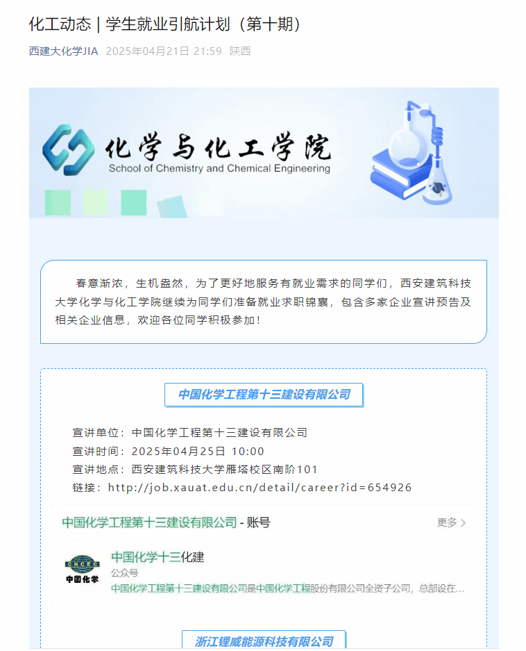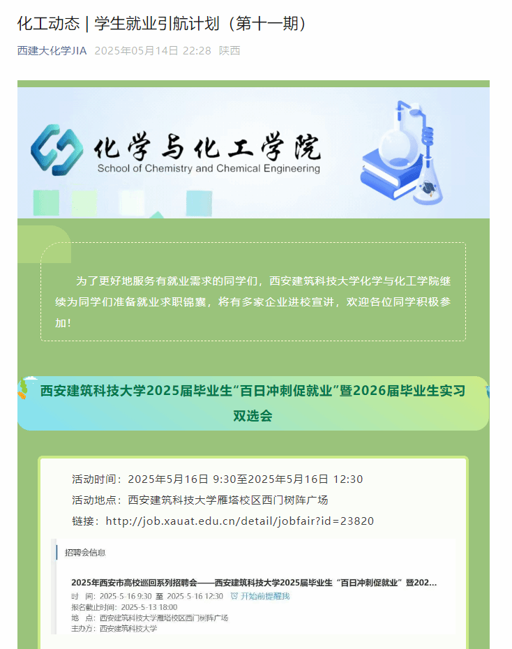 开展学生就业引航计划。为了更好地服务求职创业中的同学们,化工学院定期为同学们准备就业求职锦囊,推送校内外即将开展的宣讲会,进一步打通求职创业信息渠道,目前“学生就业引航计划”已经持续开展到十一期。